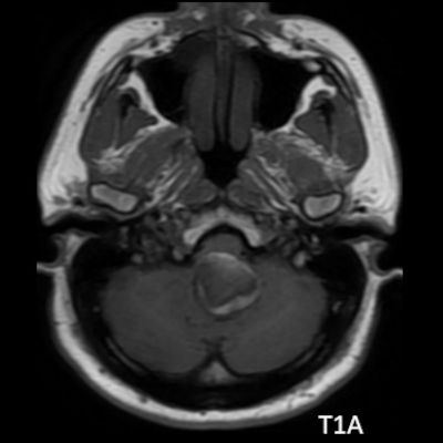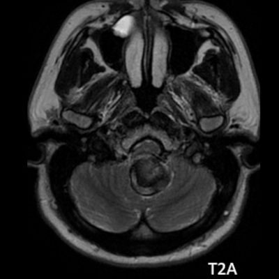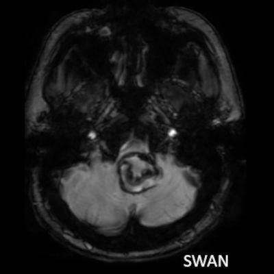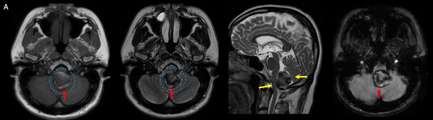 - A. Posterior fossada, T2A, T1A görüntü ve SWAN sekanslarda, 3.5 cm boyutta, düzgün sınırlı, T1A hiperintens, T2A hipointens heterojen iç yapıda kitlesel lezyon izleniyor (çember). Lezyonun serebellum ve kraniyoservikal bileşkeye bası etkisi mevcuttur (ok). Lezyon periferinde T1A, T2A ve SWAN görüntülerde hiperintens tubuler yapı bulunmaktadır (ok). Bu yapı intralezyonel “yılanvari eksantrik vasküler’’ yapıdır.