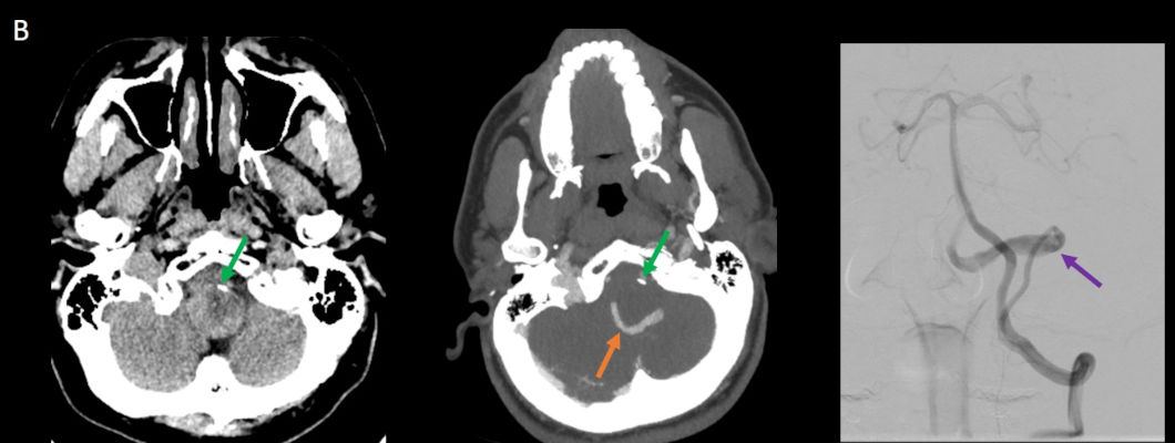 - B. Kontrastsız BT incelemede heterojen dansitede, perferinde kaba kalsifikasyon gösteren kitle lezyonu (ok), BT anjiografi MIP aksiyal kesitte yılan gibi eksantrik bir açık damar görülmektedir (ok). Sağ posterior inferior serebellar arterden (PICA) doluş gösteren tortiyoze dilate vasküler yapı (ok) DSA’ da demonstre edilmiş.