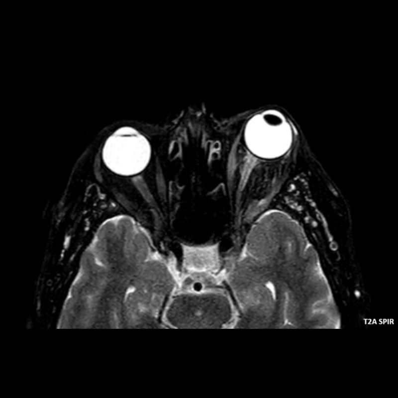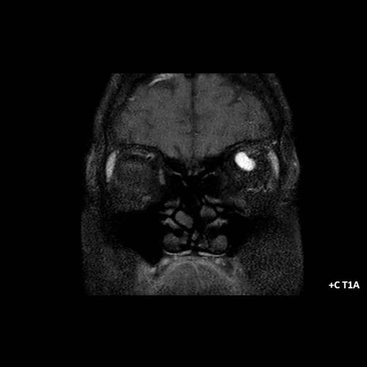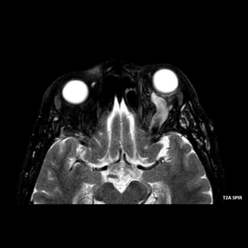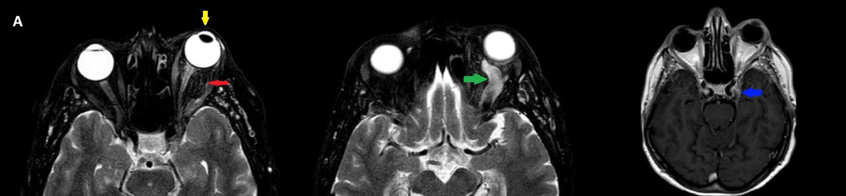 - A) Orbital MRG’de yağ baskılı T2A görüntülerde sol orbital globta ekzoftalmus (ok) izlenmiş olup retrobulbar yağlı dokuda kirlenmeler (ok) ve dilate superior oftalmik ven (ok) dikkati çekiyor. Beyin MRG’de kontrastlı T1A görüntüde sol kavernöz sinüste simetriğine oranla genişleme (ok) izleniyor.