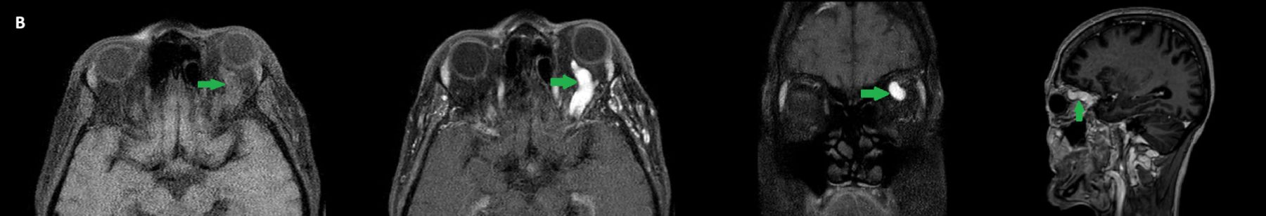 - B) Pre ve post-kontrast yağ basklılı T1A görüntüler incelendiğinde superior oftalmik venin (oklar) kontrast madde verildikten sonra homojen dolum gösterdiği, dilate ve tortiyoze görünümde olduğu izleniyor.