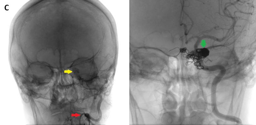 - C) DSA incelemelerinde sol eksternal karotid arter (ok) kateterizasyonunda kontrast maddenin kavernöz sinüse (ok) geçtiği izleniyor. Tedavi sonrası görüntüde kavernöz sinüs ile karotis arteriyel sistem arasında bulunan fistül traktına coil embolizasyon (ok) işlemi uygulandığı görülüyor.
