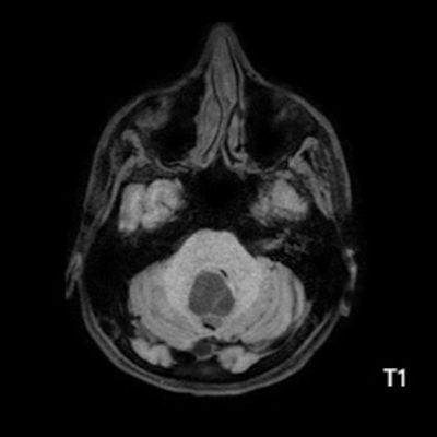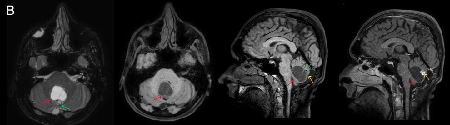 - B) Beyin MRG incelemesinde; 4. ventriküle bası etkisi oluşturan yaklaşık 3.5 cm boyutta, T2A hiperintens T1A hipointens kistik komponent (oklar) ve posteriorunda T1 ve T2A serilerde parankim ile izointens, içerisinde flow void alanların (oklar) izlendiği, post kontrast görüntülerde yoğun kontrast tutulumu gösteren mural nodül (oklar) barındıran düzgün sınırlı lezyon izlenmektedir.