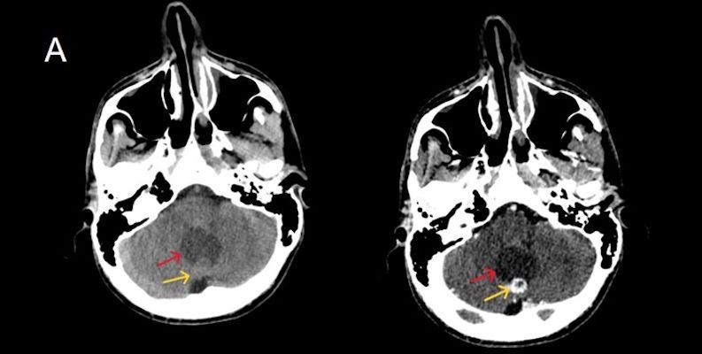 - A) Beyin BT incelemede; posterior fossada hipodens, düzgün sınırlı kistle beraber (oklar), posteriorunda 8 mm boyutunda, iyi sınırlı, kontrastsız BT’de parankim ile izodens, postkontrast görüntülerde yoğun kontrast tutulumu gösteren mural nodül komponenti (oklar) gözlenmektedir.