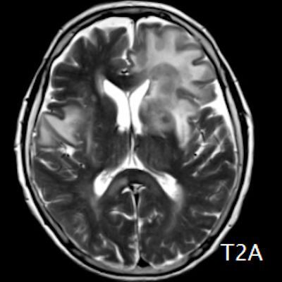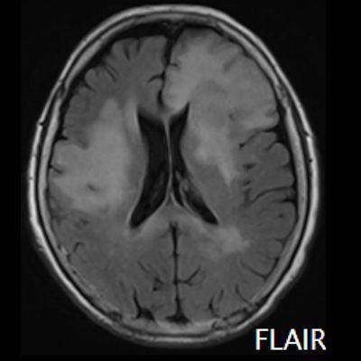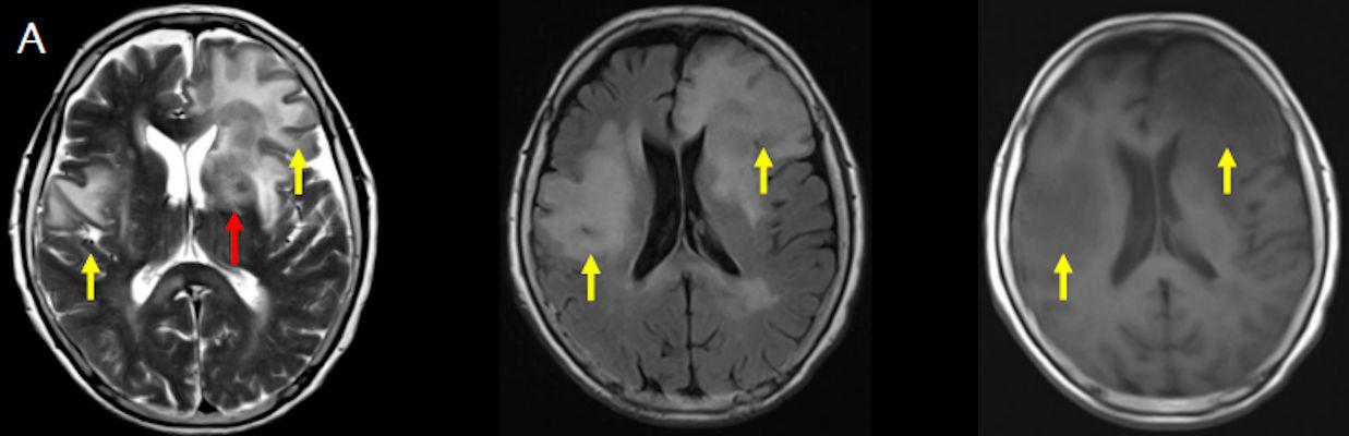 1. (A) Her iki periventriküler beyaz cevherde aksiyel T2A, FLAIR serilerde hiperintens, T1A hipointens geniş ödem alanları (oklar) izlenmektedir. Sol frontalde T2A’da hipointens kitle lezyonuna (ok) dikkat ediniz.