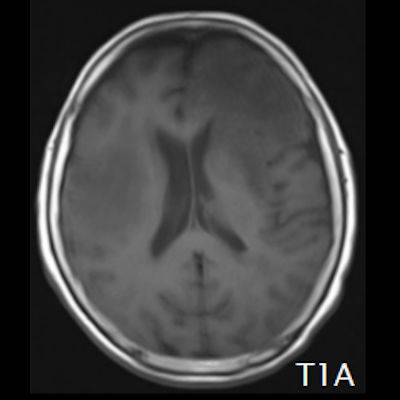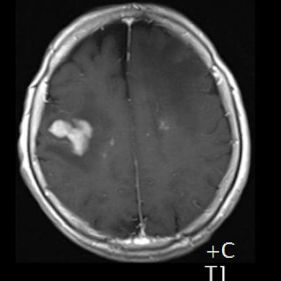 9. Olguda tanı sol frontalde kontrast tutan lezyondan yapılan beyin biyopsisi ile konulmuştur.