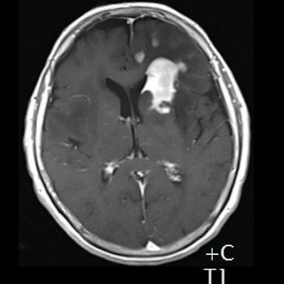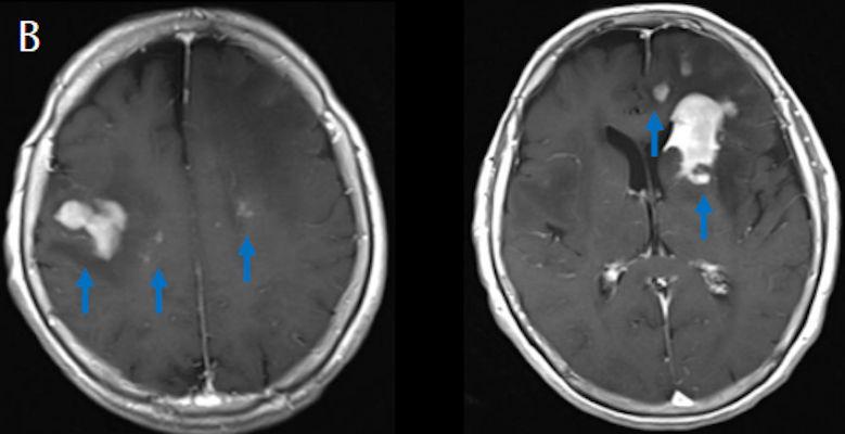 2. (B) Aksiyel postkontrast T1A görüntülerde büyüğü sol frontalde kontrastlanma gösteren multipl kitle lezyonları (oklar) izlenmektedir.