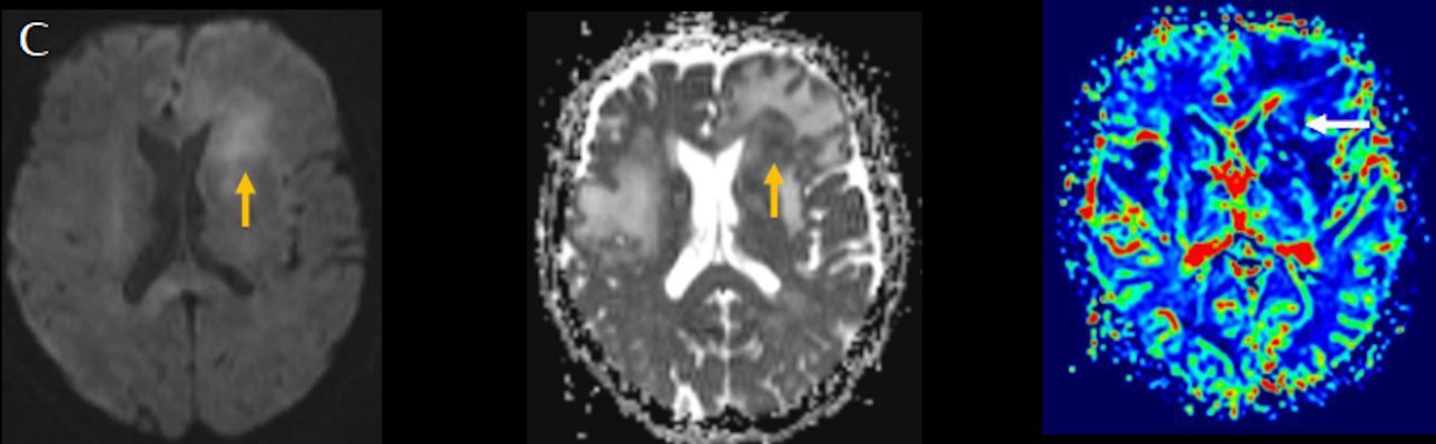 3. (C) Difüzyon ağırlıklı görüntülerde sol frontaldeki kitle lezyonunda difüzyon kısıtlama bulgusu (oklar) mevcut olup perfüzyon MRG’de rCBV haritasında belirgin perfüzyon artışı izlenmemektedir (ok).