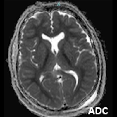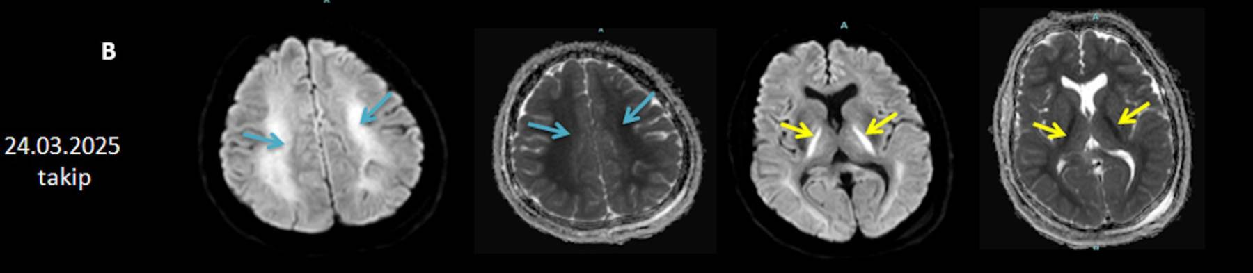 - B) 9 gün sonraki difüzyon MR incelemede kortikal ve bazal ganglionlardaki difüzyon kısıtlamalarının gerilediği, bilateral serebral beyaz cevherde (oklar) ve internal kapsül arka bacağı- kortikospinal trakt boyunca (oklar) yaygın DAG hiperintens, ADC hipointens difüzyon kısıtlamalarının geliştiği izleniyor.
