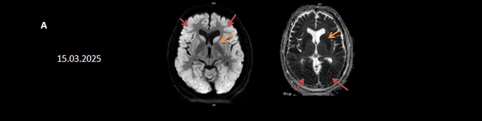 - A) Bilateral serebral kortekste (oklar) ve bazal ganglionlarda (oklar) yaygın DAG hiperintens, ADC hipointens difüzyon kısıtlamaları görülüyor.
