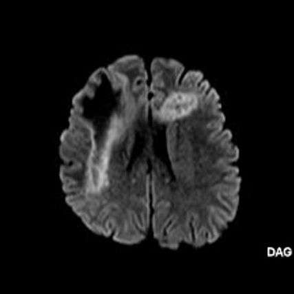 3. Kontrastlı incelemelerde genellikle kontrast tutulumu izlenmez. Diffüzyon görüntülemede özellikle lezyonun ilerleyen periferik alanlarında yamalar halinde diffüzyon kısıtlılığı izlenir. MR spektroskopide NAA azalması, laktat varlığı ve artmış kolin ve lipid düzeyleri görülür. MR perfüzyonda ise lezyonların ilerleyen kenarında perfüzyon artışı saptanabilir.
