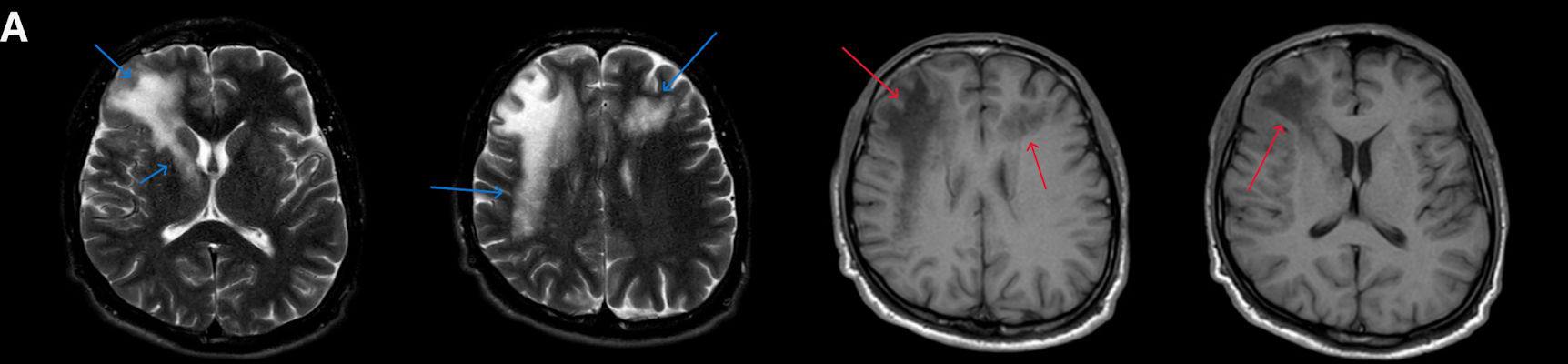 1. A) Aksiyel T2A görüntülerde bilateral sağda belirgin frontoparietal subkortikal ve derin periventriküler beyaz cevherde subkortikal U fiberleri boyunca yerleşimli sinyal artımları (oklar) izlendi.  Tarifli alanlar aksiyel T1A serilerde hipointens görünümde (oklar) izlendi.
