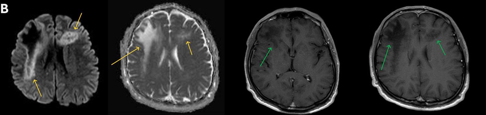 2. B) Aksiyel diffüzyon ağırlıklı serilerde bilateral sağda belirgin frontoparietal subkortikal ve derin periventriküler beyaz cevherde periferal DAG hiperintens ADC hipointens, hafif diffüzyon kısıtlaması (oklar) eşlik etmektedir. IVKM sonrası kesitlerde tarifli alanlarda belirgin kontrast tutulumu (oklar) izlenmedi.