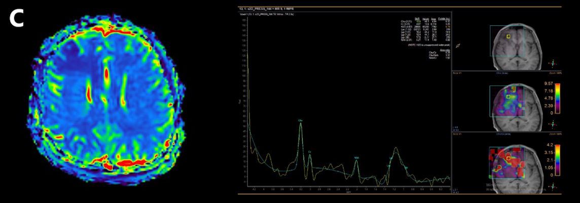 3. C) Tanımlanan düzeylere yönelik yapılan Perfüzyon MR incelemede belirgin perfüzyon artışı saptanmadı. Bu düzeye yönelik yapılan TE 144 multi ve single voksel MRS incelemede Cho/Cr  oranlarında hafif artış, NAA oranlarında azalma mevcuttur. Yer yer laktat pikleri görüldü.