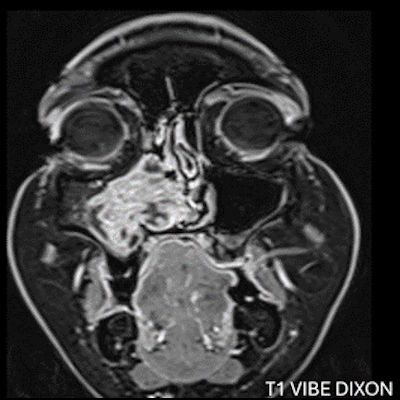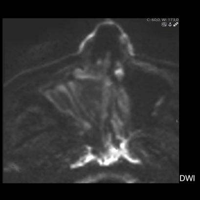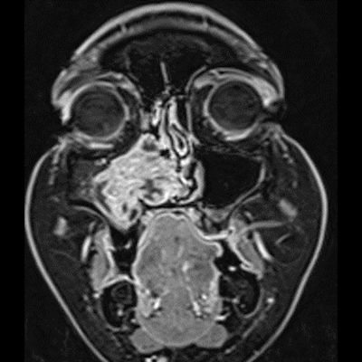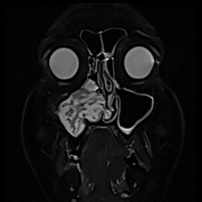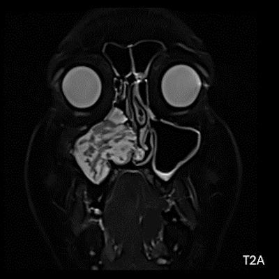 - MR incelemesinde sinonazal inverted papilloma tipik olarak T2 ve post-kontrast T1 serilerde ‘convoluted’ serebriform paternde heterojen sinyal ve kontrastlanma gösteren, pedinküler orijininde daha belirgin perfüzyon artışı sergileyen, genellikle difüzyon kısıtlaması izlenmeyen ve komşu sinüs duvarlarında ekspansiyona bağlı remodelinge yol açabilen benign ancak lokal agresif karakterde bir yumuşak doku kitlesi olarak izlenir.