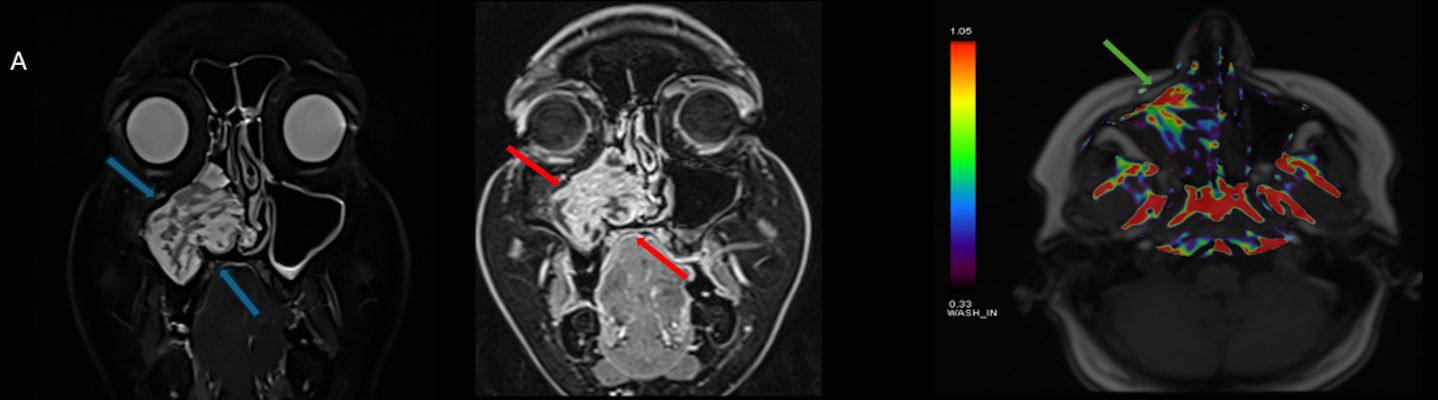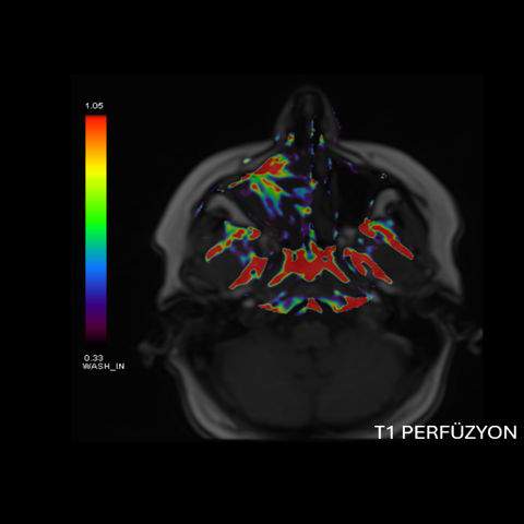 - A) Koronal T2 ağırlıklı görüntülerde sol maksiller sinüs lümenini dolduran, belirgin ‘convoluted’ (karmaşık-kıvrımlı) serebriform patern sergileyen lezyon (oklar), kontrastlı seride heterojen ve yoğun kontrastlanma göstermektedir (oklar). Perfüzyon incelemesinde pedinkülünde perfüzyon artışı gösterdiği, diğer kontrastlanan segmentlerin nispeten hipoperfüze olduğu görülmektedir (ok).