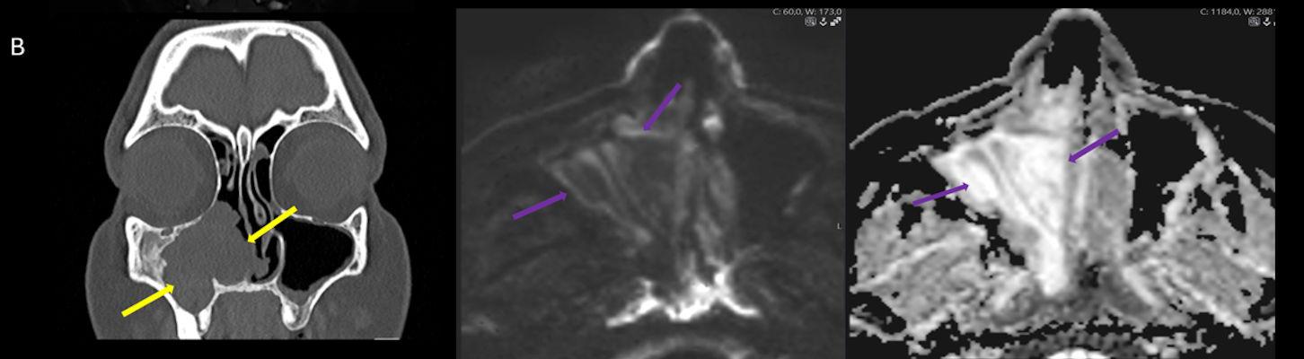 - B) BT incelemesinde maksiller sinüsün duvarları özellikle lateralde daha belirgin olmak üzere reaksiyonel kalınlaştığı izleniyor (oklar). DWI ve ADC haritasında lezyonda belirgin bir kısıtlılık görülmemektedir (oklar).