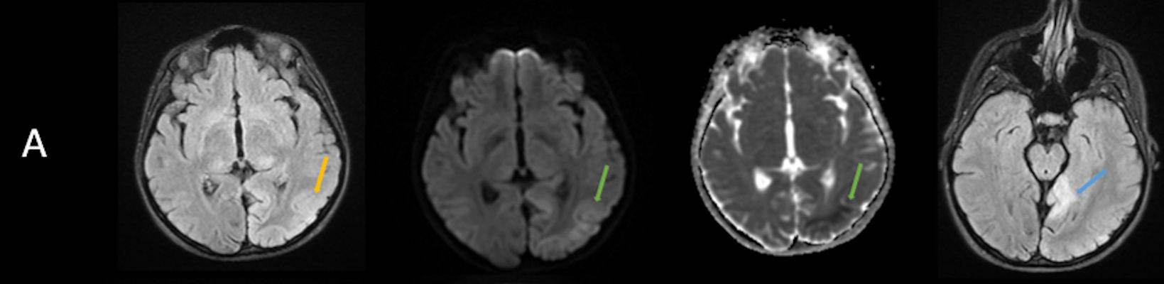 - A) Aksiyel FLAIR görüntülerde parietooksipital lobda kortikal hiperintensite (ok) ve difüzyon görüntülerde kısıtlanma alanları izleniyor (oklar). Ertesi gün çekilen kontrol MRG’de FLAIR serilerde yeni gelişen oksipital bölgede kortikal hiperintensite (ok) izlenmektedir.