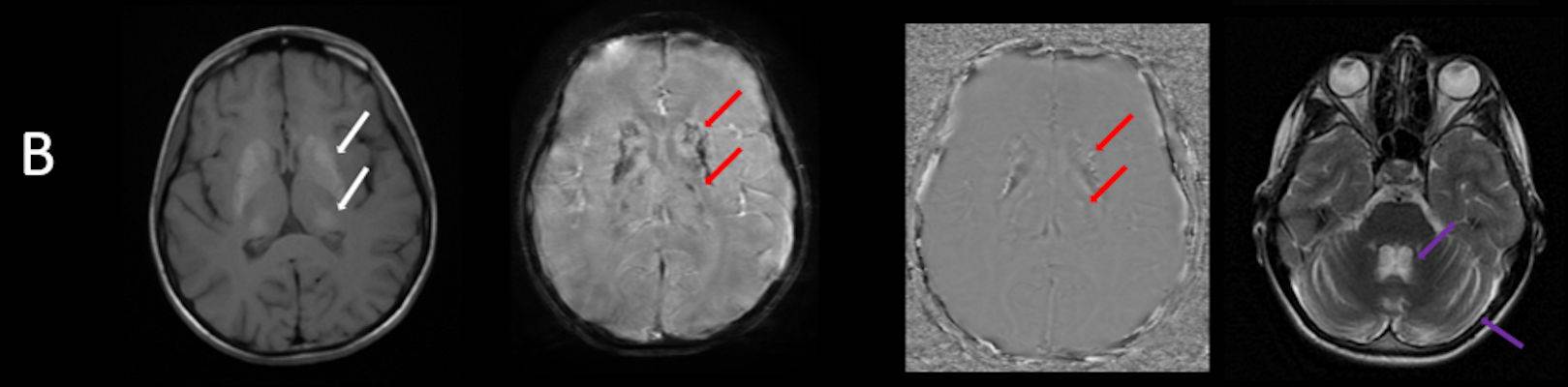 - B) Aksiyel T1A görüntülerde her iki lentiform ve kaudat nukleuslarda, talamuslarda simetrik hiperintensite (oklar) izleniyor. Bu düzeyde tariflenen sinyallerin SWI ve faz görüntülerde kalsifikasyon ile uyumlu olduğu görülmektedir (oklar). T2A görüntüde yaş ile uyumsuz serebellar atrofi ile uyumlu foliada derinleşme ve 4. ventrikül genişliğinde artış izlenmektedir (oklar).