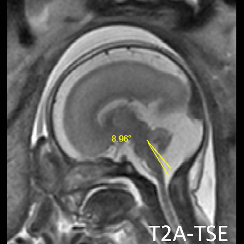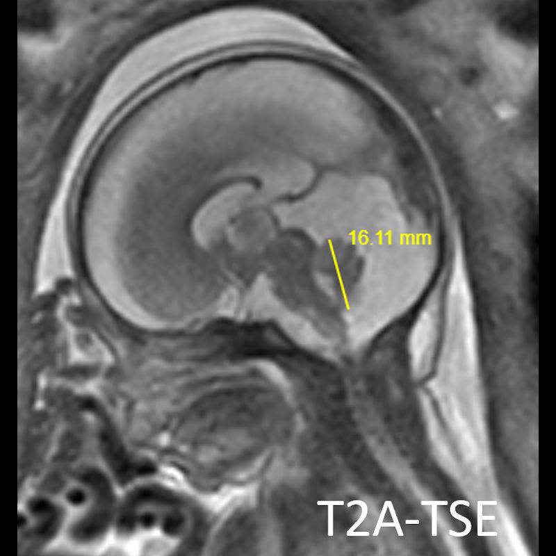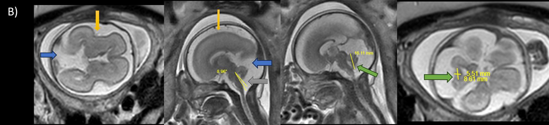- B) Aksiyel ve sagittal T2A görüntülerde gyrus ve sulkuslarda azalma mevcut olup korteks kalınlaşmış görünümde ve operkulizasyon ayırt edilememiştir. Korteks beyaz cevher ayrımı zor seçilmektedir (ok) Ekstraaksiyel BOS mesafesi artmış görünümdedir (ok). Yapılan ölçümlerde; tegmentovermian açı :8 derece (ok) serebellar vermis boyutları kraniokaudal: 16 mm, aksiyel: 5,5×8,5 mm (ok) ölçülmüş olup BPD:27w ile uyumlu olan fetüste haftasıyla uygun olarak değerlendirilmiştir.