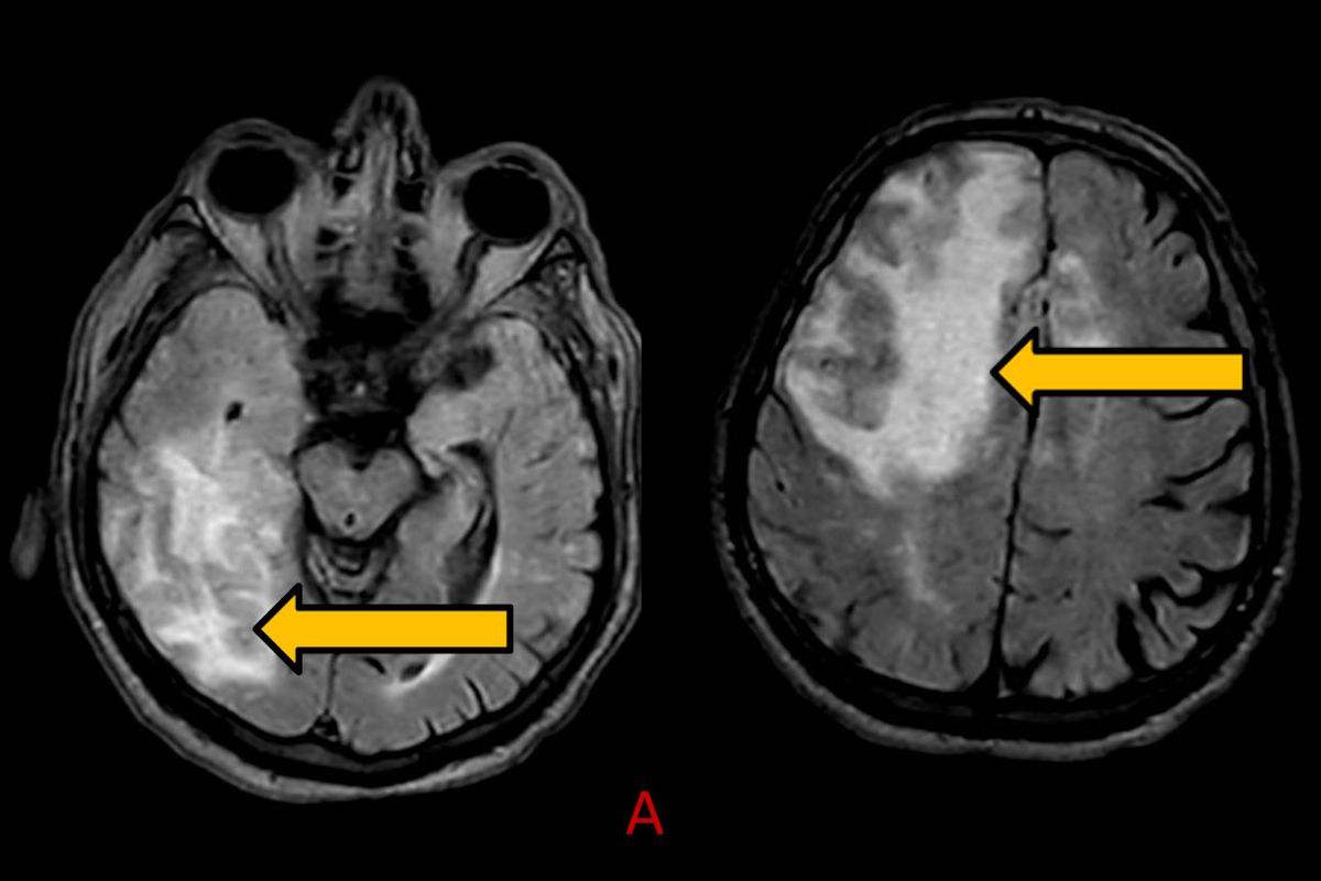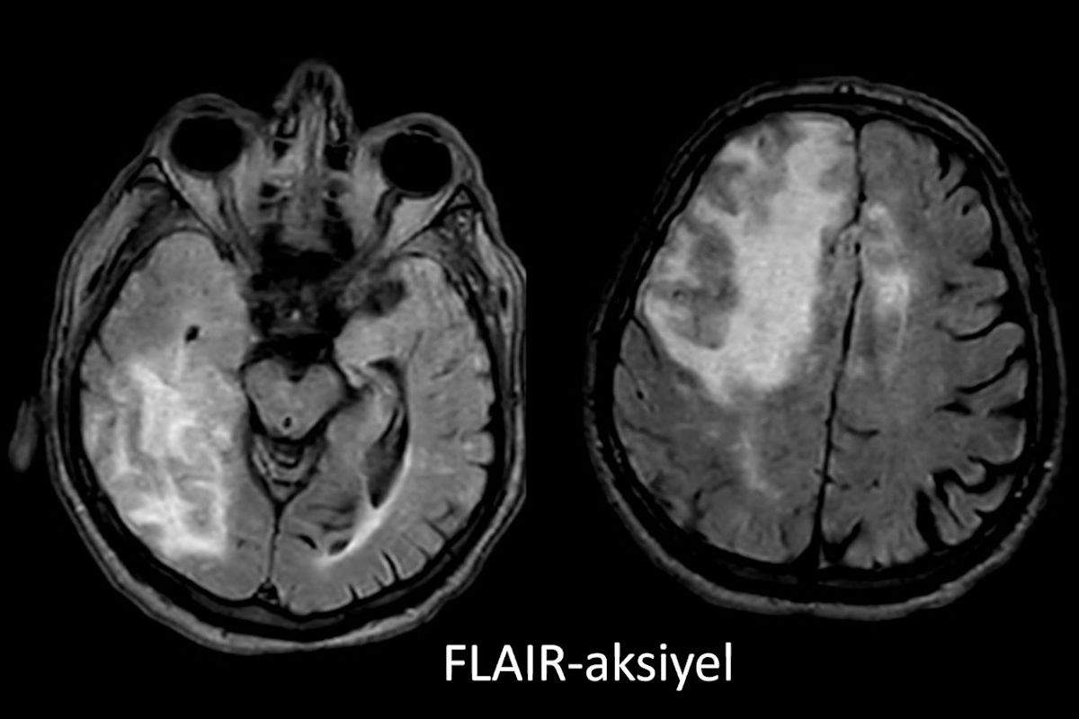 - A) Aksiyel planda FLAIR sekansta asimetrik kortiko-subkortikal vazojenik ödemi düşündüren yüksek sinyalli hafif ekspansil lezyonlar (turuncu ok).