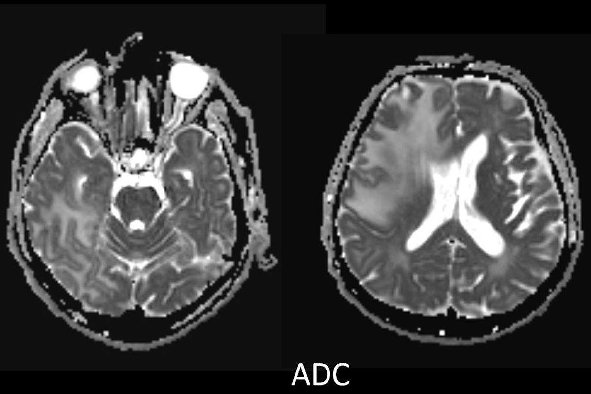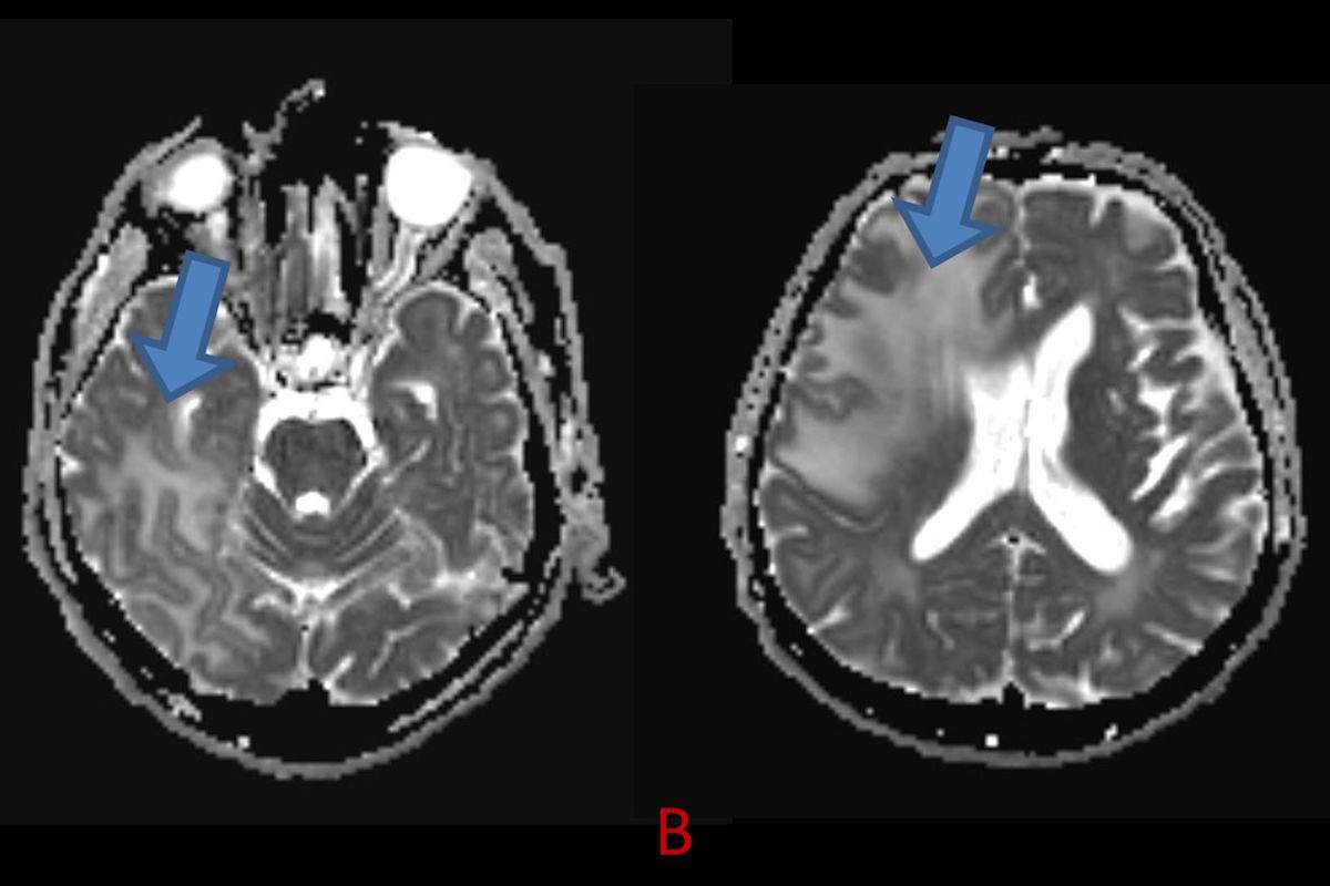 - B) ADC haritasında kolaylaşmış difüzyon (mavi ok).