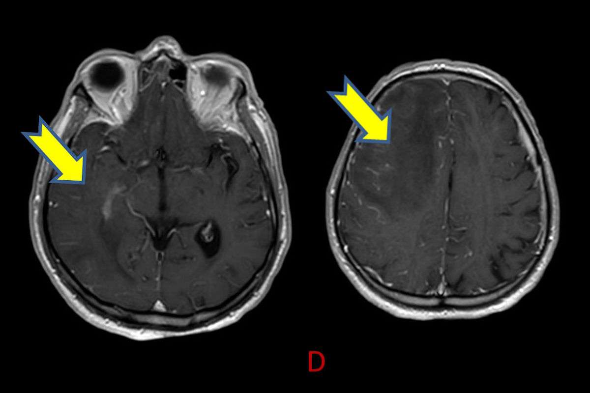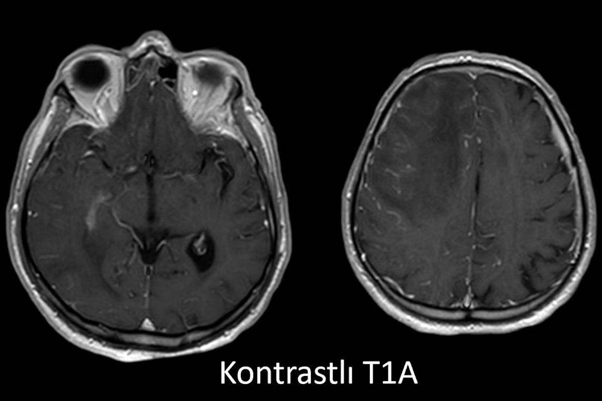 - D) Kontrastlı T1A sekansta hafif leptomeningeal boyanma (sarı ok).