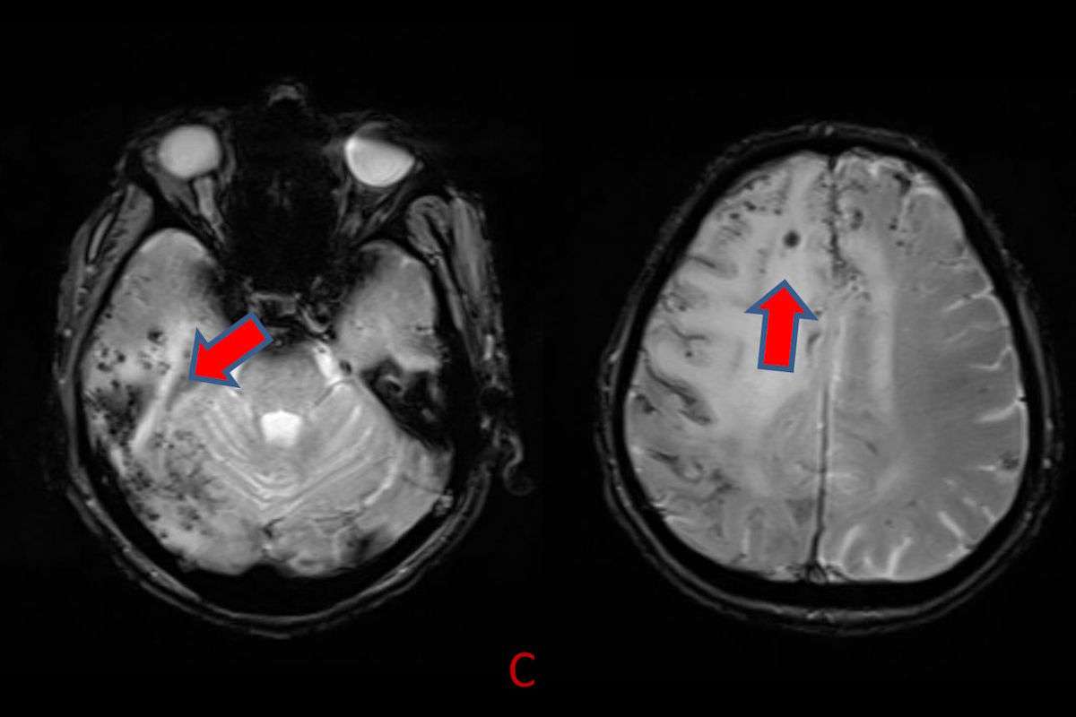 - C) Gradient seride milimetrik hemosiderin kalıntıları ve süperfisyal siderozis (kırmızı ok)